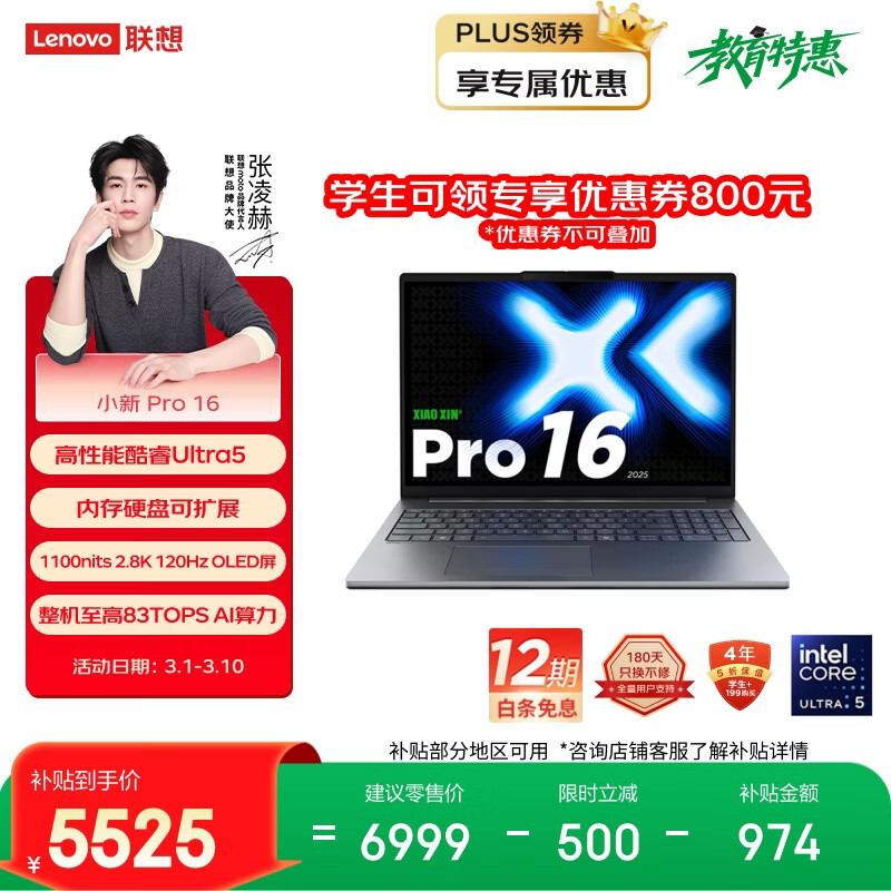 联想笔记本电脑小新Pro16超能本 酷睿Ultra5 32G 1T 2.8K 120Hz OLED 大屏轻薄办公本 游戏 国家补贴