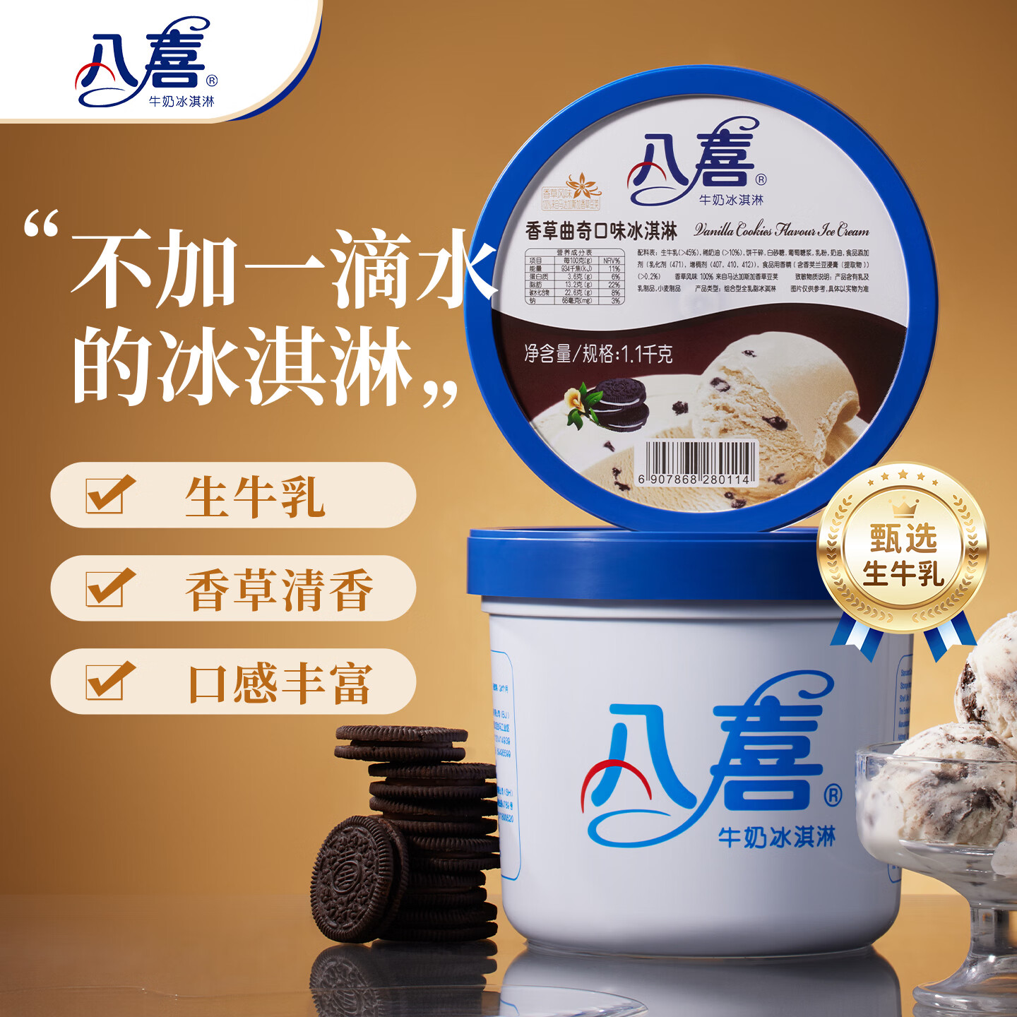 八喜冰淇淋 香草曲奇口味1100g*1桶 家庭装 生牛乳冰淇淋大桶
