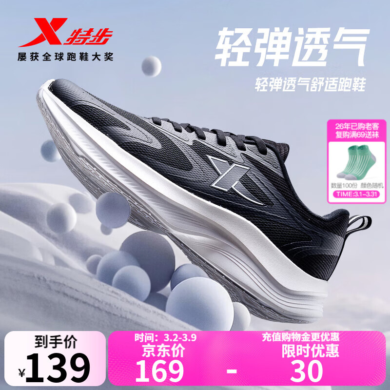 特步跑步鞋男鞋新品透气防滑耐磨运动通勤休闲鞋户外徒步鞋男透气轻盈 黑/帆白 42