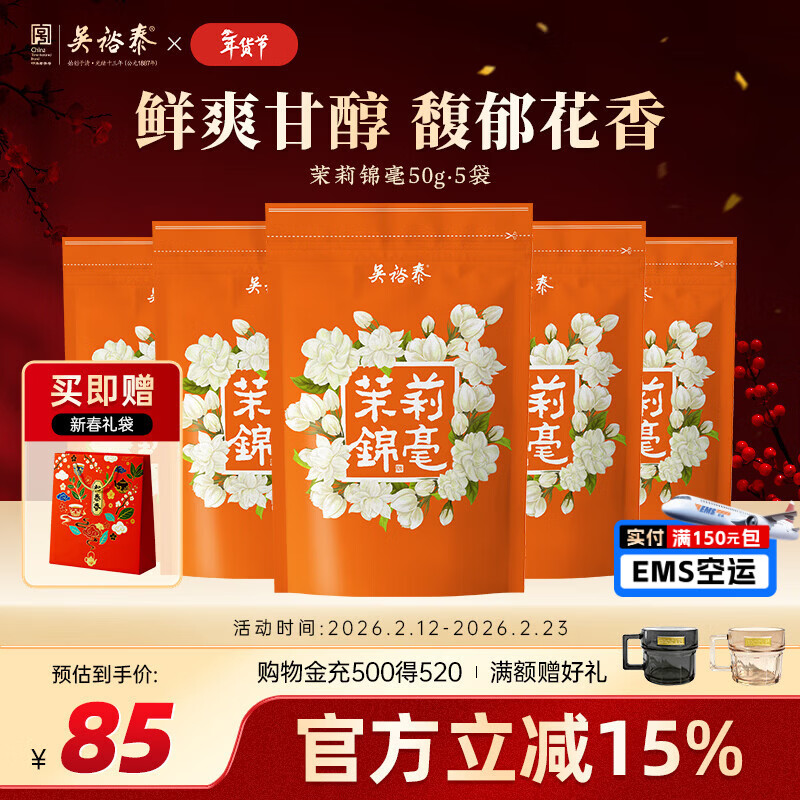 吴裕泰茶叶茉莉花茶特种浓香六窨含芽口粮花草茶 茉莉锦毫 50g*5袋组合