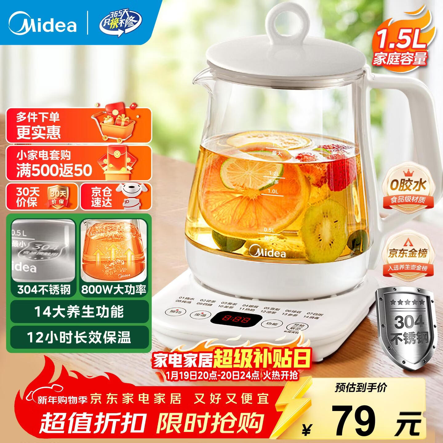 美的(Midea)养生壶大容量 煮茶器智能预约1.5L烧水壶 恒温煮茶壶 办公室电水壶 花茶壶 【店铺力荐】14大养生功能12Q 1.5L