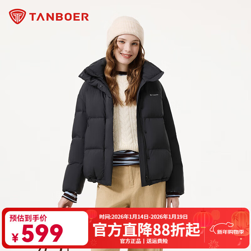 坦博尔羽绒服女短款2025冬季新款时尚舒适简约纯色百搭保暖外套 黑色 XS