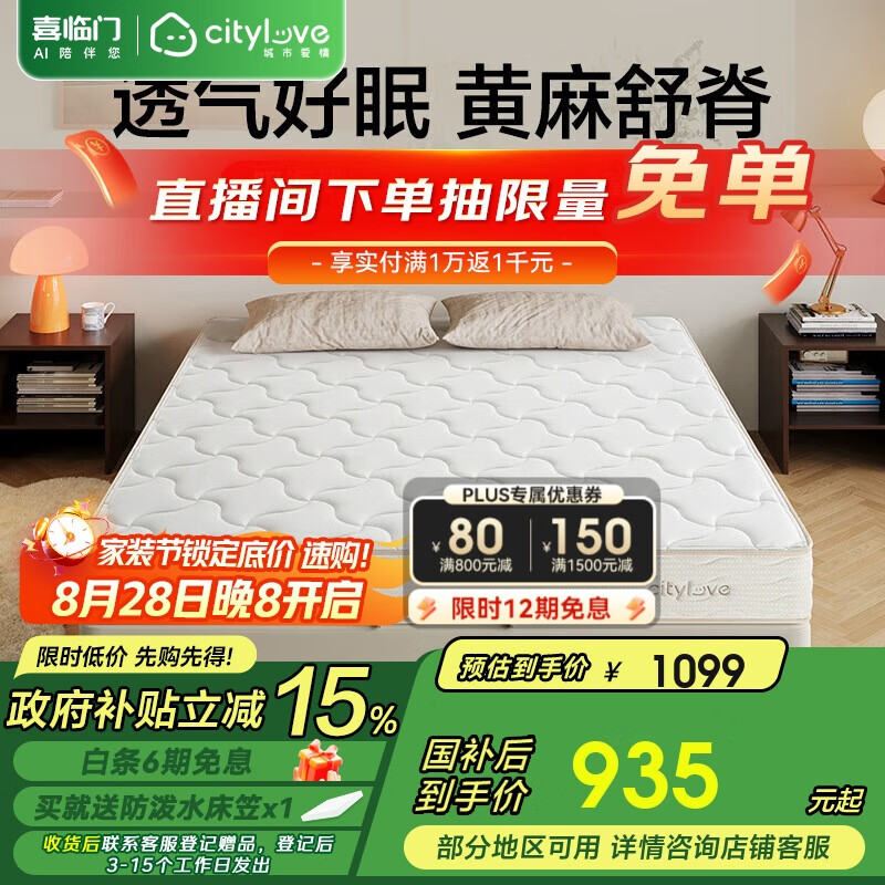 喜临门城市爱情床垫 偏硬黄麻独立弹簧舒脊席梦思 大白Lite H2 1.5x2米