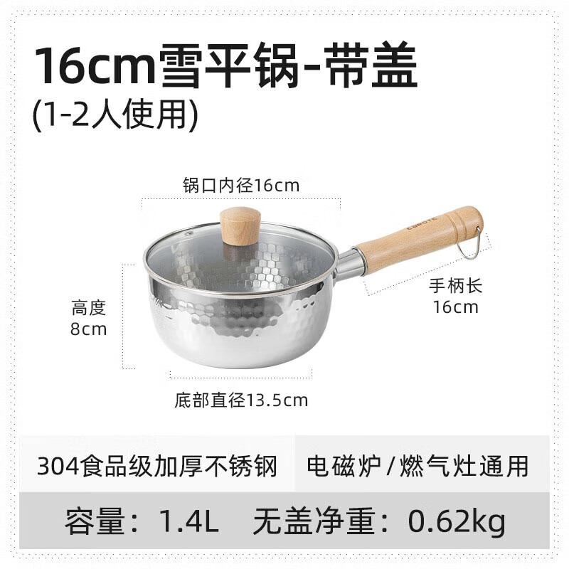 臻古朴雪平锅304不锈钢奶锅无涂层不粘锅婴儿宝宝辅食锅泡面锅煮面粥锅 雪平锅 带锅盖 16cm