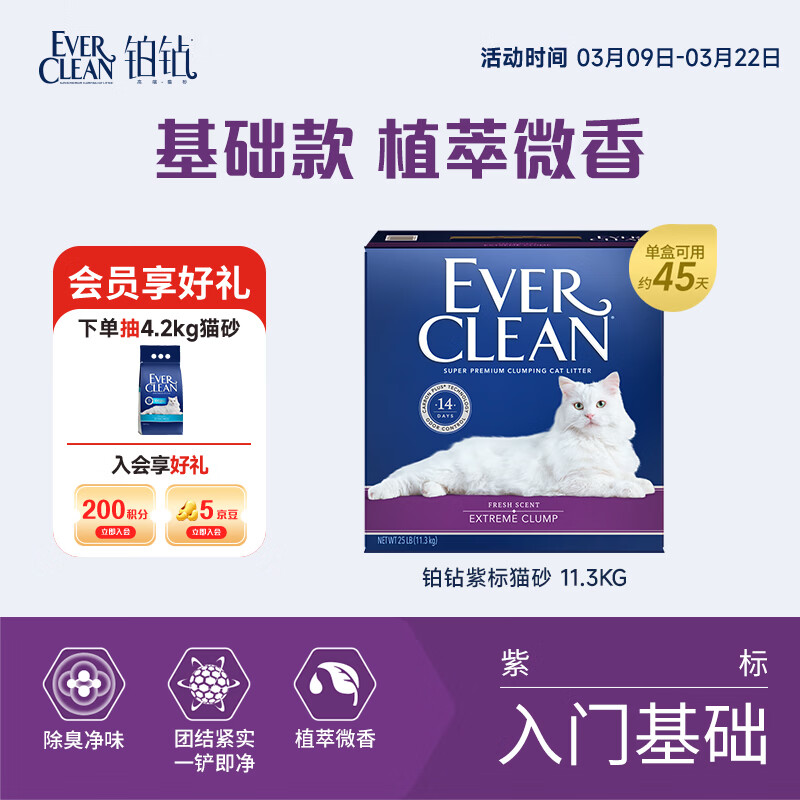铂钻EverClean速凝抗菌低尘膨润土猫砂 (紫标)11.3kg/10L