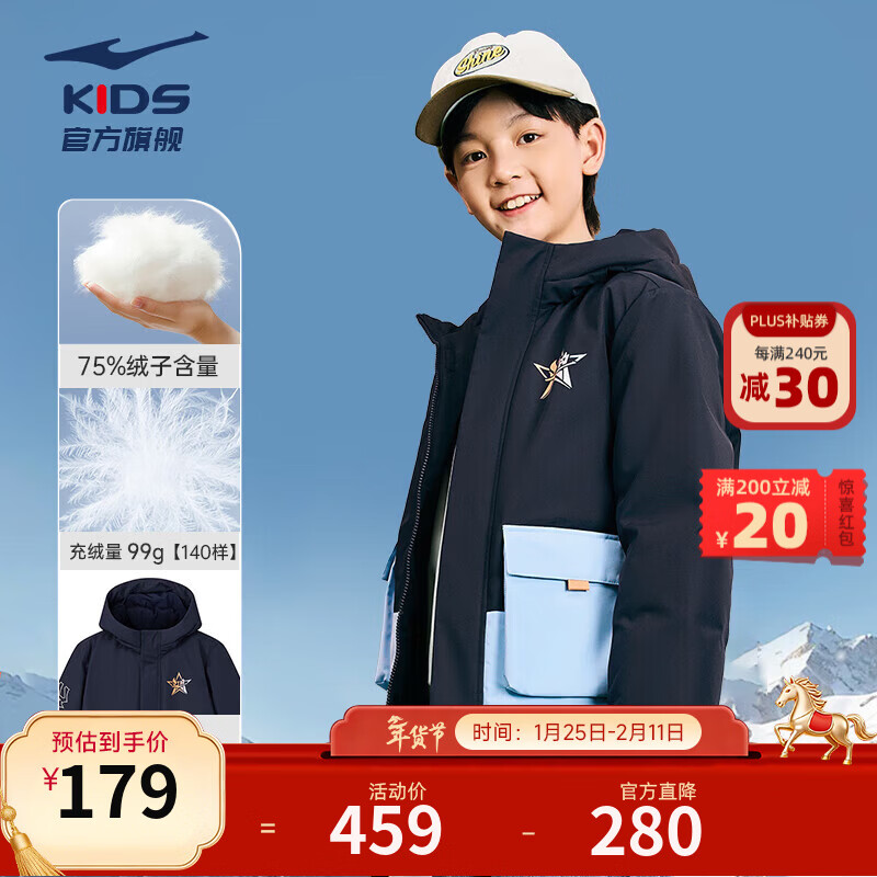 鸿星尔克童装儿童羽绒服男女童三防高蓬鸭绒运动保暖外套马年新年款拜年服 蓝黑色-绒子含量75% 165 充绒量138g
