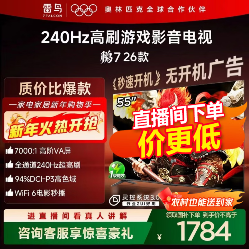 FFALCON雷鸟鹏7 26款55英寸 高阶VA全通道240Hz高刷 满血HDMI2.1 94%P3色域灵控系统55英寸平板电视55S78A 55英寸 国家补贴