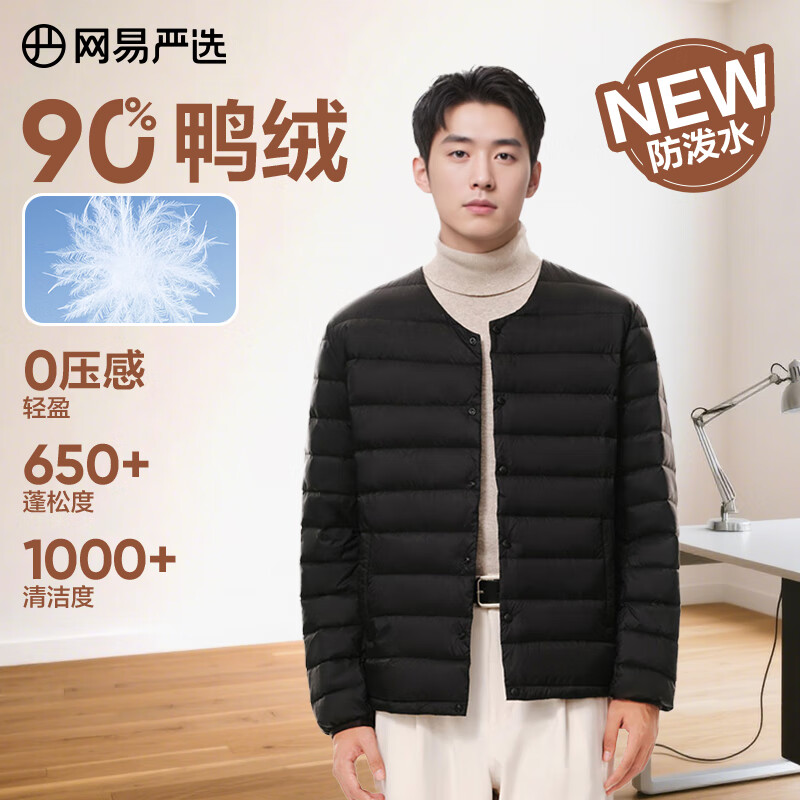 网易严选25新品90鸭绒轻暖羽绒服保暖0压感防泼水蓄热抗菌外套抗静电 A款-25秋冬-水墨黑-无领 L