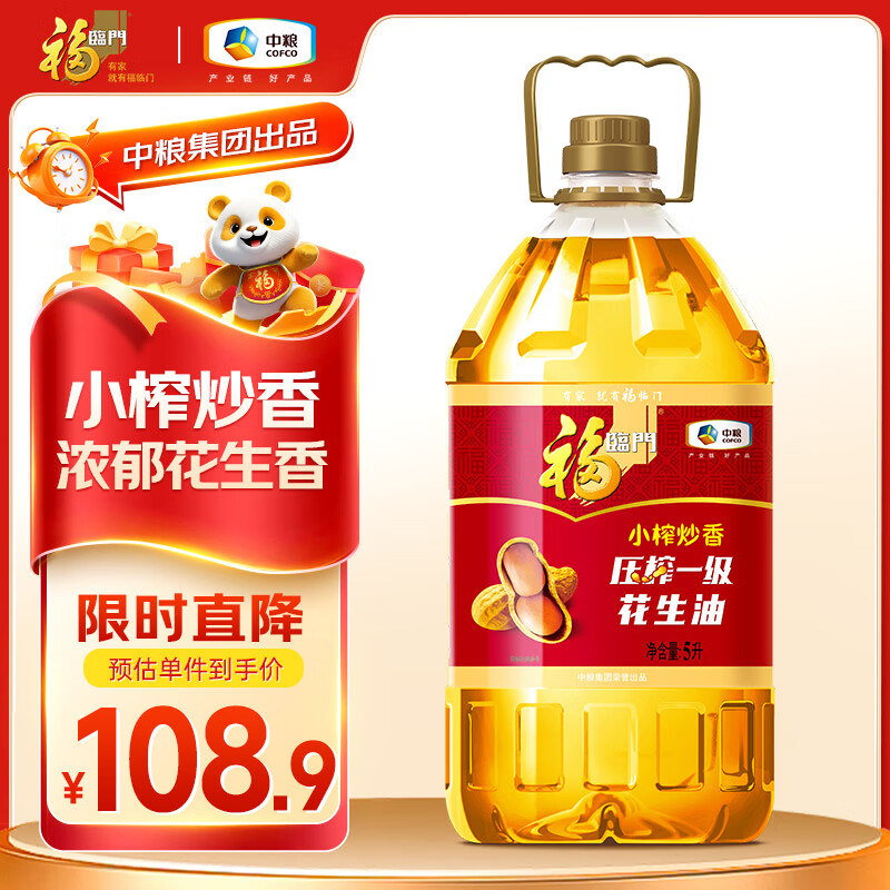 福临门食用油 小榨炒香压榨一级 花生油5L 中粮出品