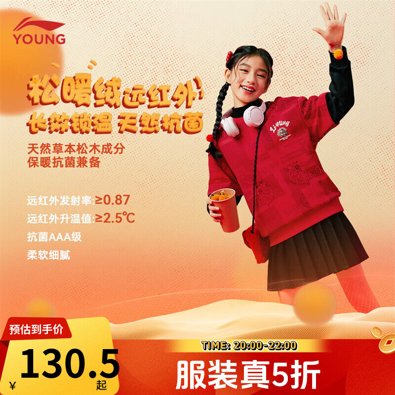 李宁童装儿童卫衣男女小大童新年系列加绒宽松套头运动上衣YWDV087 朱砂红-2 110