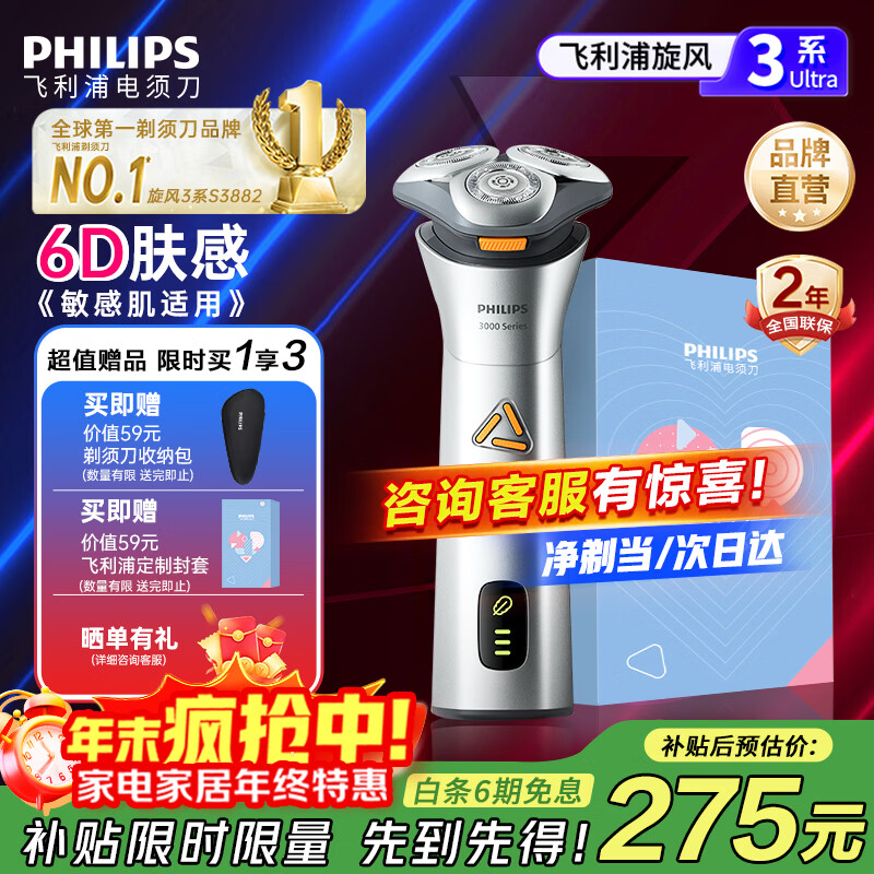 飞利浦(PHILIPS)电动剃须刀电动男士2025新款小科技旋风3刮胡刀飞利浦剃须刀官方旗舰正品送老公新年生日礼物实用 【爆款礼套】旋风3系PRO 极光米银