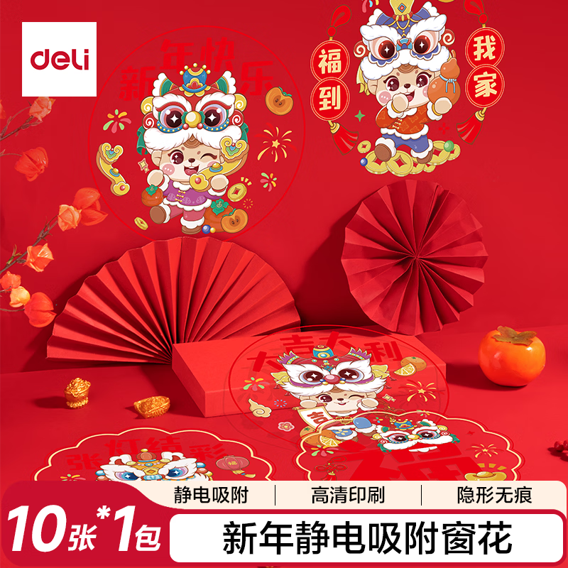 得力(deli)元旦装饰新年挂件过年新春2026马年春节布置玻璃贴 新年静电窗花(10张装)