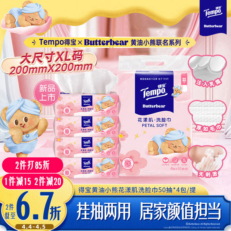 得宝(TEMPO)黄油小熊联名款 悬挂洗脸巾50抽*4包 一次性毛巾 XL码绵柔巾婴儿