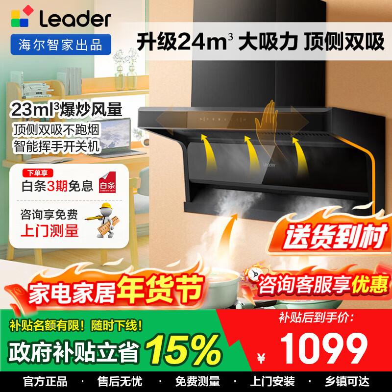 海尔(Haier)顶侧双吸油烟机Ieader家用抽油烟机24m爆炒吸力自清洁一级能效家电排烟机 【单烟机】24爆炒吸力