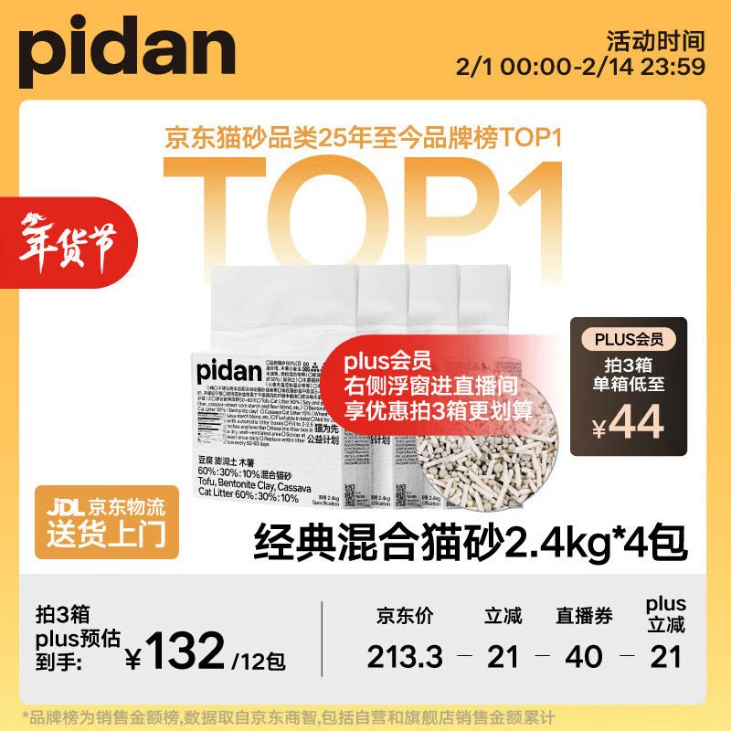pidan混合猫砂 豆腐膨润土木薯60%:30%:10%混合2.4kg*4包自营猫砂