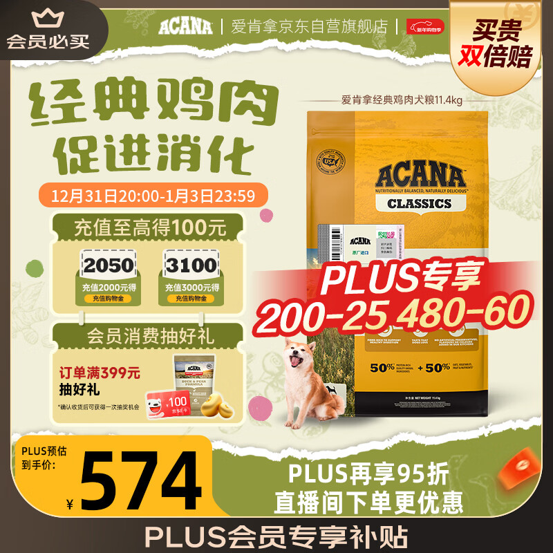 愛肯拿(ACANA) 狗粮 通用成犬幼犬 经典鸡肉草原天然犬粮11.4kg效期26/9