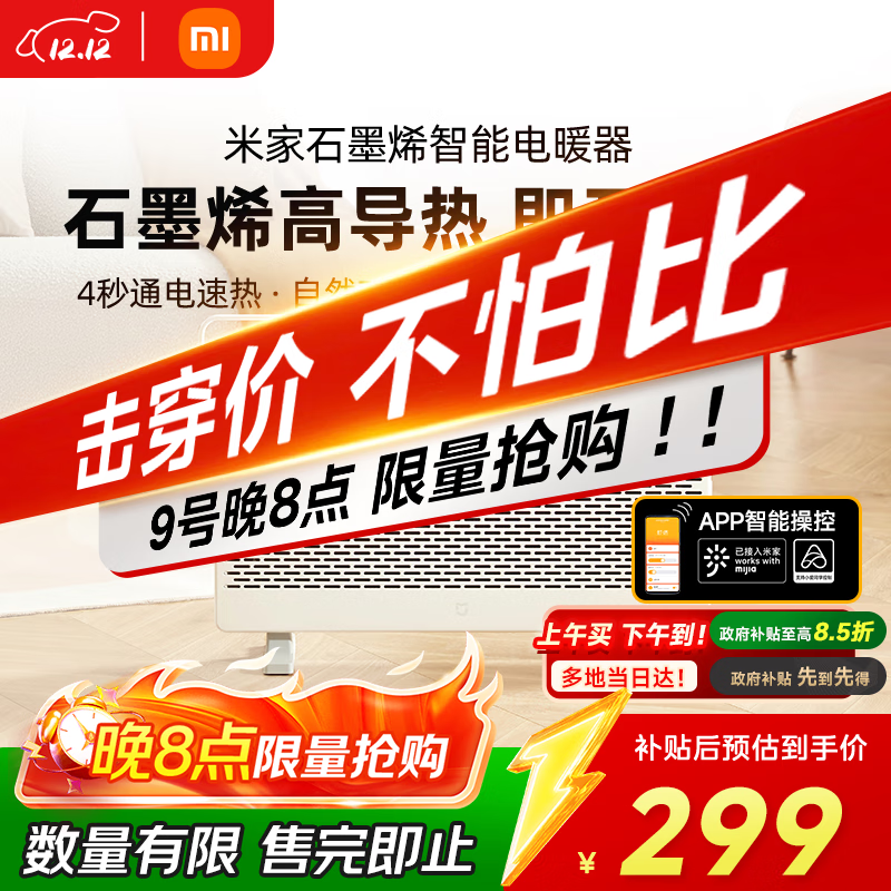 米家小米智能石墨烯取暖器欧式快热炉电暖器六档调温IPX4防水电热取暖器家用KRDNQ05ZM