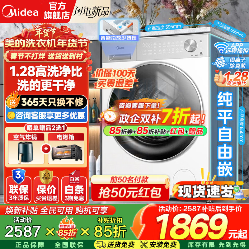 美的(Midea)滚筒洗衣机全自动国家补贴 10/12公斤大容量 一级能效变频节能 健康除菌 纯平自由全嵌 以旧换新 10公斤非烘干L1|1.28洗净比+智能投放 单洗