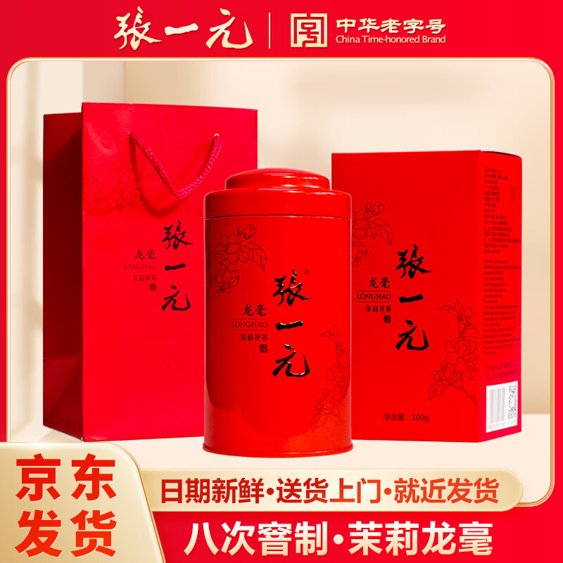 张一元茶叶特种茉莉花茶八窨茉莉龙毫中华老字号金奖花茶盒装配手提袋 龙毫100g