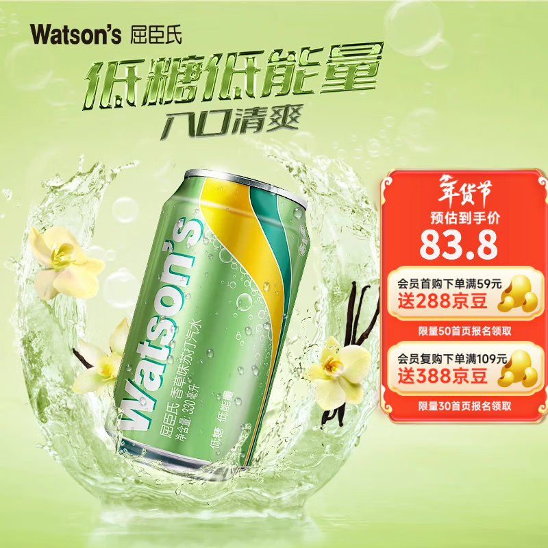 屈臣氏(Watsons)苏打汽水气泡水饮料调酒推荐330ml*24罐整箱装 香草味