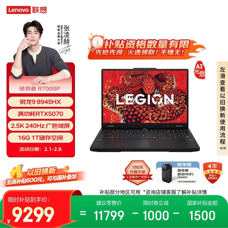 联想拯救者R7000P AI元启 游戏笔记本电脑(锐龙9 8945HX 16G 1T RTX5070 2.5K 240Hz 黑) 国家补贴