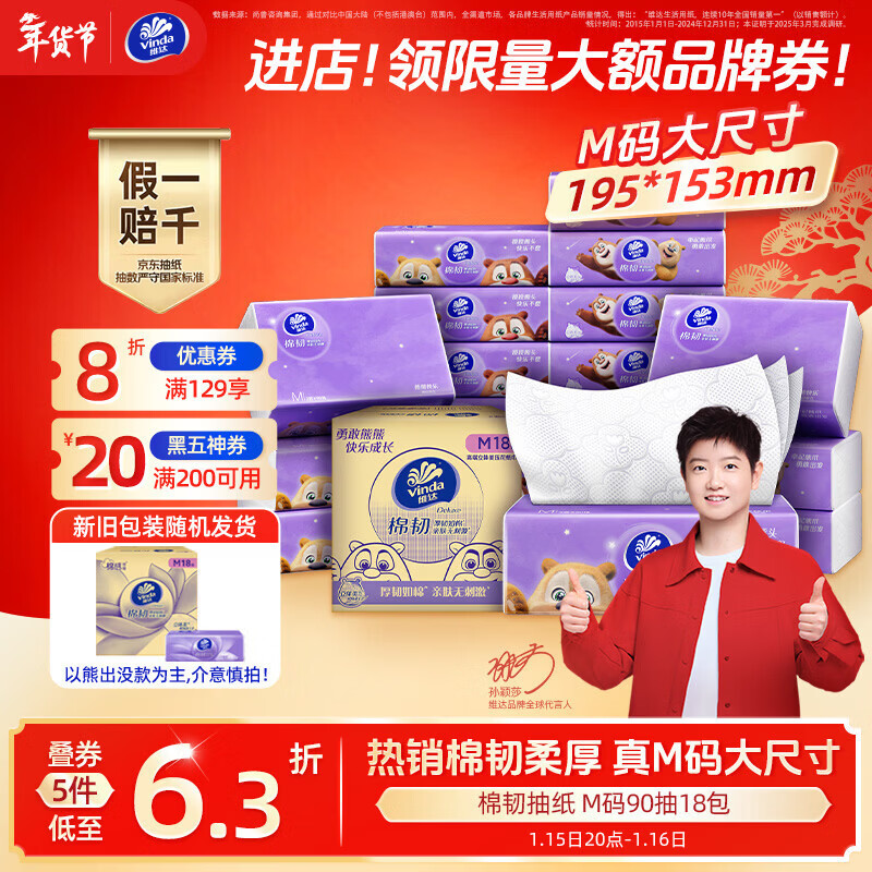 维达(Vinda)抽纸 棉韧3层90抽*18包M码纸巾 经典款熊出没款随机发货