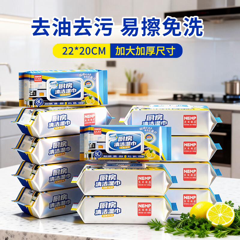 沐本棉品大包厨房清洁湿巾 重油污油烟机清洁强力去油污不伤手用纸 1层 80抽*4包 (22*20cm)