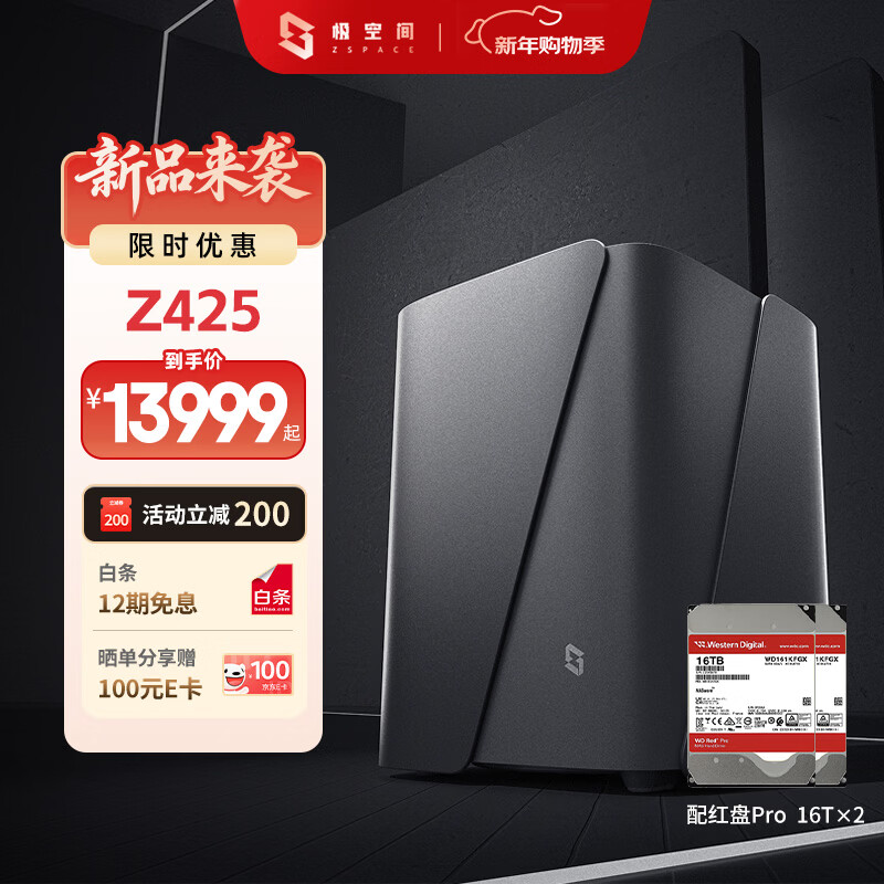 极空间Z425旗舰版 14核14线程四盘位NAS网络存储企业团队办公服务器配专属UPS(搭配2块红盘Pro 16TB硬盘)