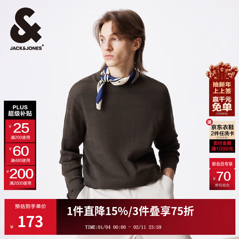 杰克·琼斯(JACK&JONES)男装秋季常规纯棉罗纹圆领基础百搭舒适长袖毛针织衫男224324003 黑橄榄E06 常规 黑橄榄E06 M 175