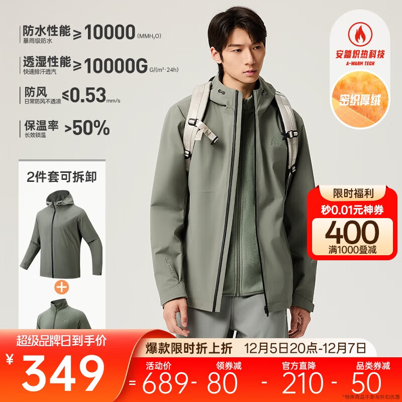 安踏水壳3.0冲锋衣丨大地之壳户外三合一冲锋衣男暴雨级登山外套