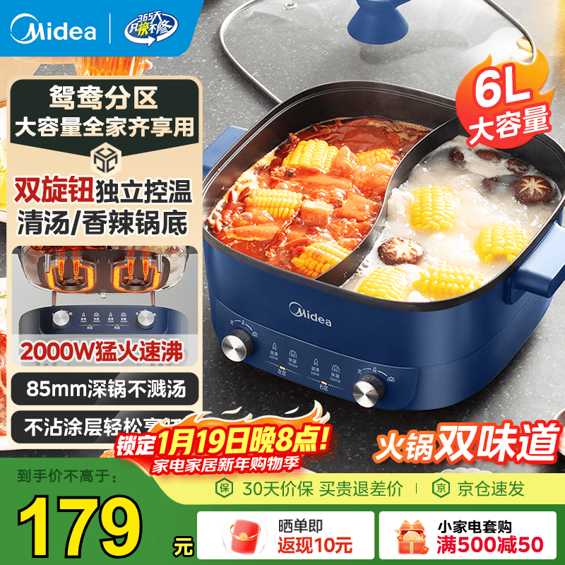 美的(Midea)电火锅 鸳鸯锅 火锅专用锅 电煮锅多功能锅6分钟速沸双旋钮分区双控家用电热锅6L多用途锅火锅锅 6L 【2000W猛火速沸】 HGC303012