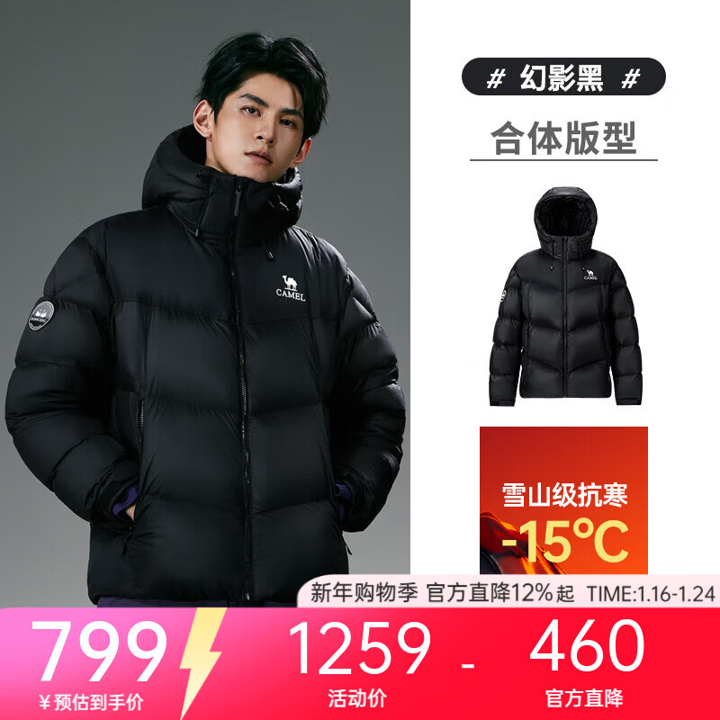 骆驼火山PRO鹅绒服迪丽热巴同款情侣款面包服新款鹅绒速暖羽绒服 幻影黑 男女同款 M