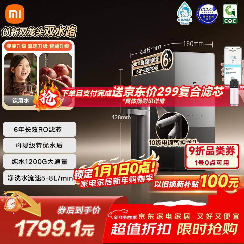 米家【双出水】小米净水器pro双出水双龙头1200G家用大通量厨下直饮6年RO过滤净饮一体净水机 MR1292