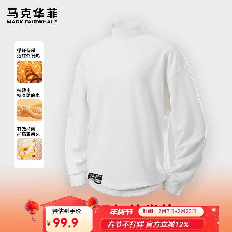 马克华菲(MARK FAIRWHALE)秋冬季半高领长T男士软糯细腻亲肤抗菌保暖抗静电潮流百搭款内搭 【柔软细腻】-白#纯色 XL