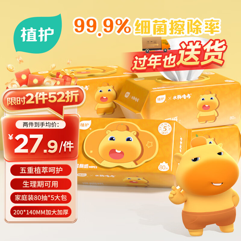 植护水豚噜噜联名款湿厕纸家庭装80抽*5包 可水解洁厕湿纸巾 全家适用