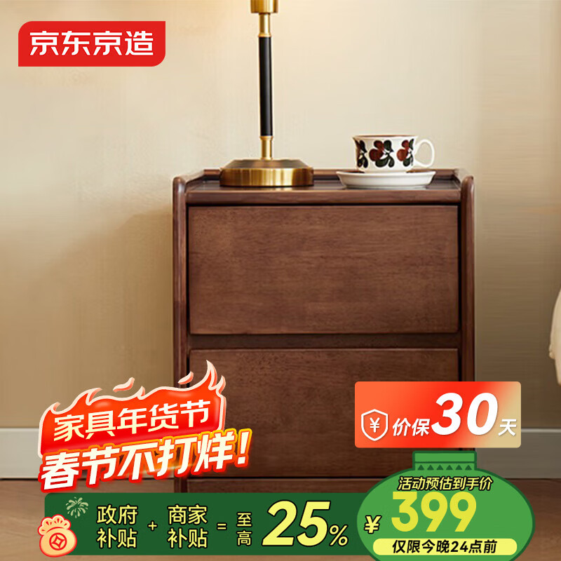 京东京造家居悦枫实木床头柜 天然橡胶木双层储物 收纳卧室储物柜胡桃色