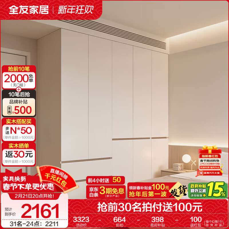全友家居现代简约顶天立地大衣柜家用卧室分段式衣橱边柜子组合 【栀子白 | 2*2.4m】五门衣柜 堪比定制+内配感应灯+双色可选
