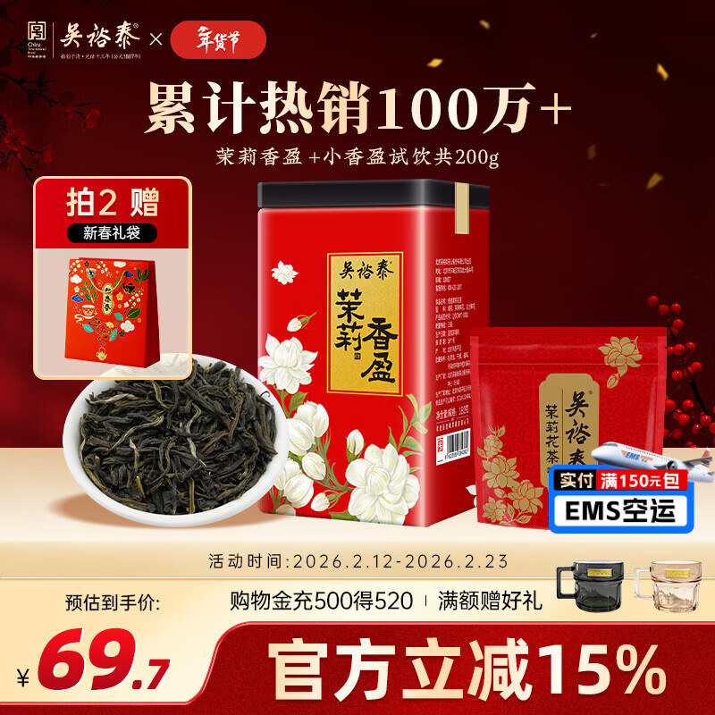 吴裕泰茶叶茉莉花茶特种浓香六窨含芽口粮花草茶 茉莉香盈 180g+品鉴装20g组合