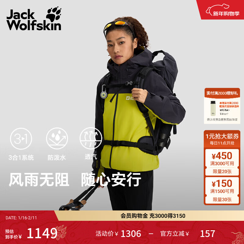 jackWolfskin狼爪25秋冬新款TAUBENBERG男款户外抓绒三合一冲锋衣外套A65384 连翘黄/M0053 S