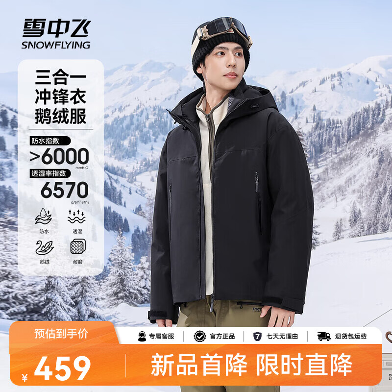 雪中飞【一衣三穿】【鹅绒】新款中性立领连帽加宽帽檐冲锋衣羽绒服 黑色|8056 175/96A