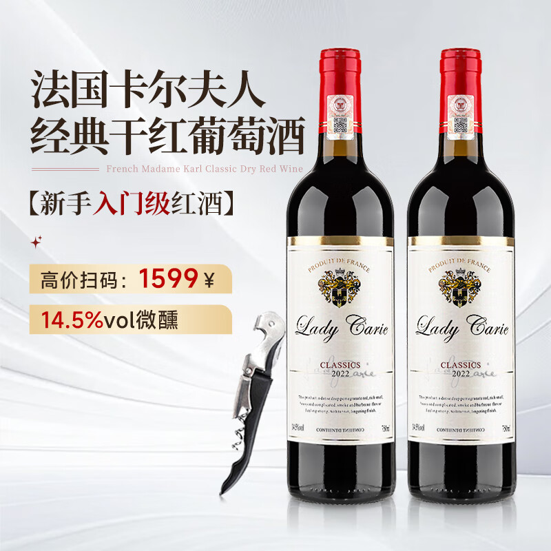 卡尔夫人(LadyCarle)法国进口红酒干红葡萄酒 原酒进口 中秋礼品750ml*2