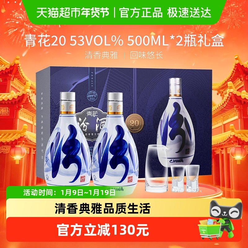 【年货礼盒】汾酒53度青花20清香型白酒礼盒500ml*2瓶送礼宴请