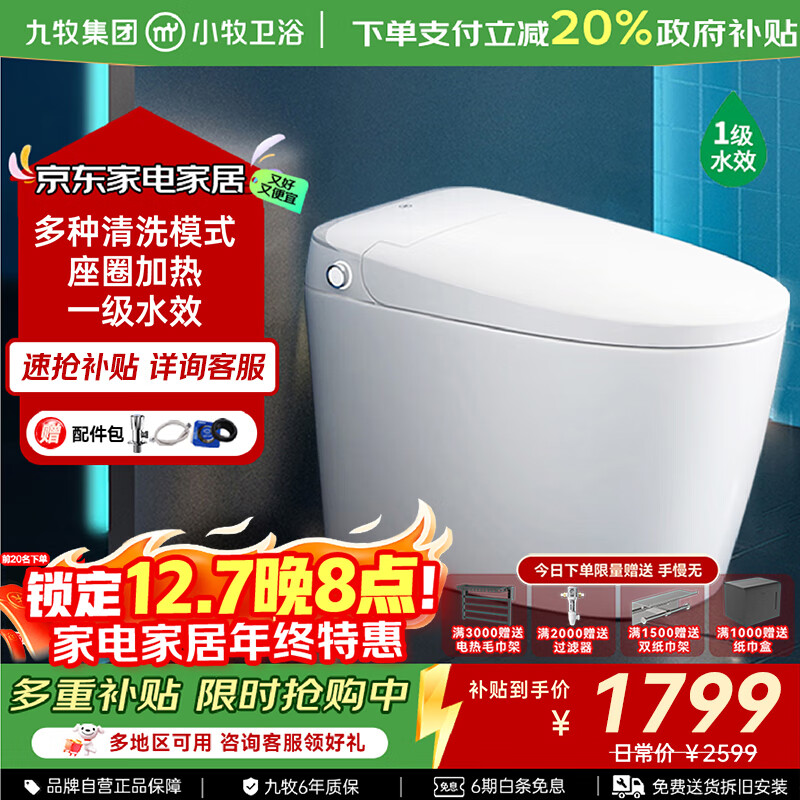 九牧(JOMOO)智能马桶小牧卫浴智能除臭抗菌零压带水箱一体式坐便器 X3-5130 座圈加热+清洗烘干+抗菌 400mm 【390以上选择】