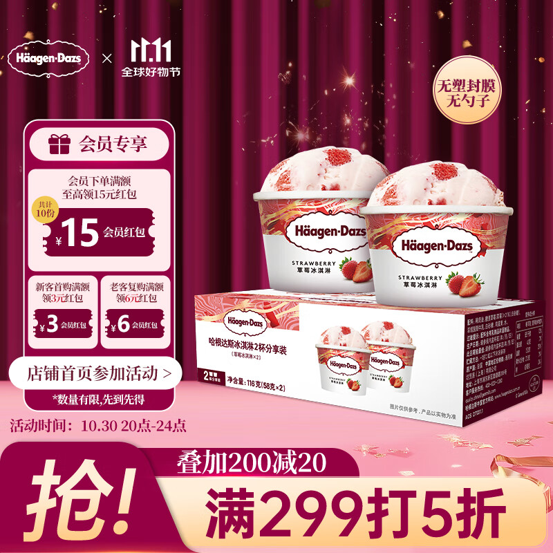 哈根达斯(Haagen-Dazs)经典草莓口味冰淇淋2杯分享装共116g
