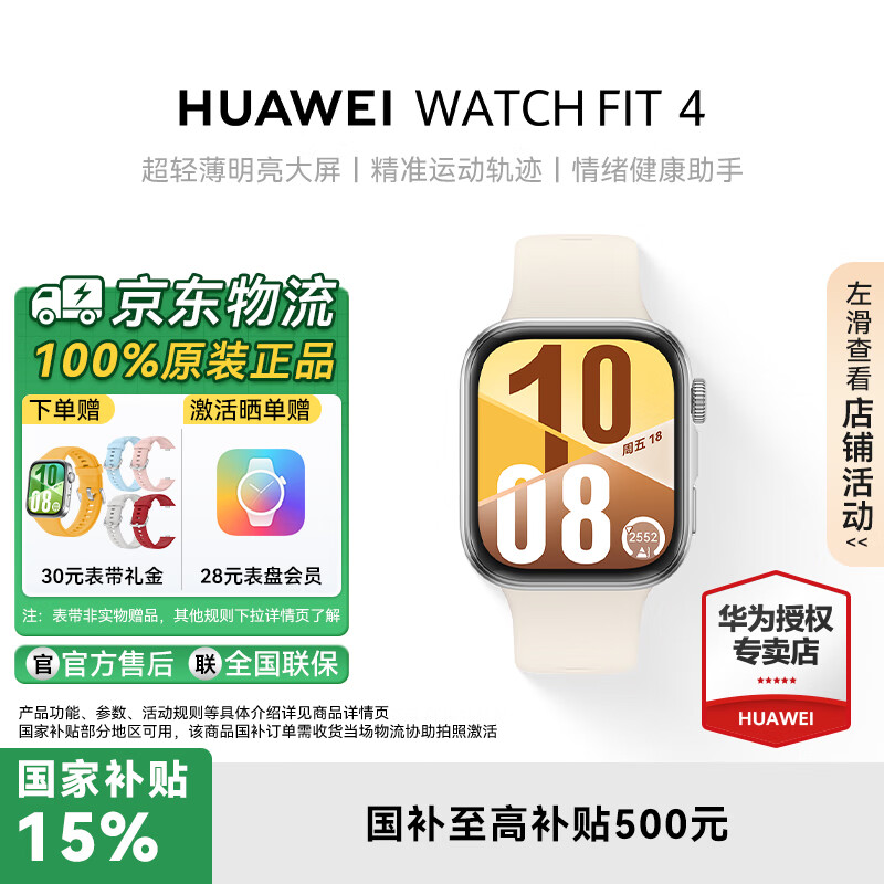 华为(HUAWEI)手表WATCH FIT 4 国补蓝牙通话轻薄大屏运动血氧健康健身长续航智能手表【华为官方授权店】 悦动白 氟橡胶表带