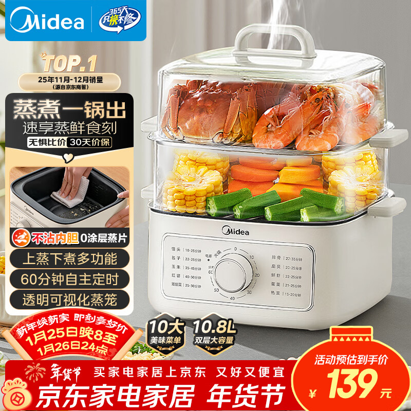 美的(Midea)电蒸锅电煮锅电火锅多功能锅家用电炒锅蒸蛋器蒸包子锅电热锅10.8升三层大容量多用途锅ZGE2323Z02