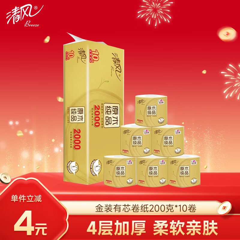 清风【李昀锐同款】有芯卷纸 金装4层加厚 200克*10卷 卫生纸