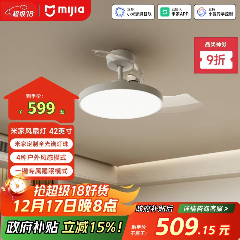 米家(MIJIA)小米米家风扇灯吊扇灯隐形卧室42英寸全光谱Ra97灯具【包安装】