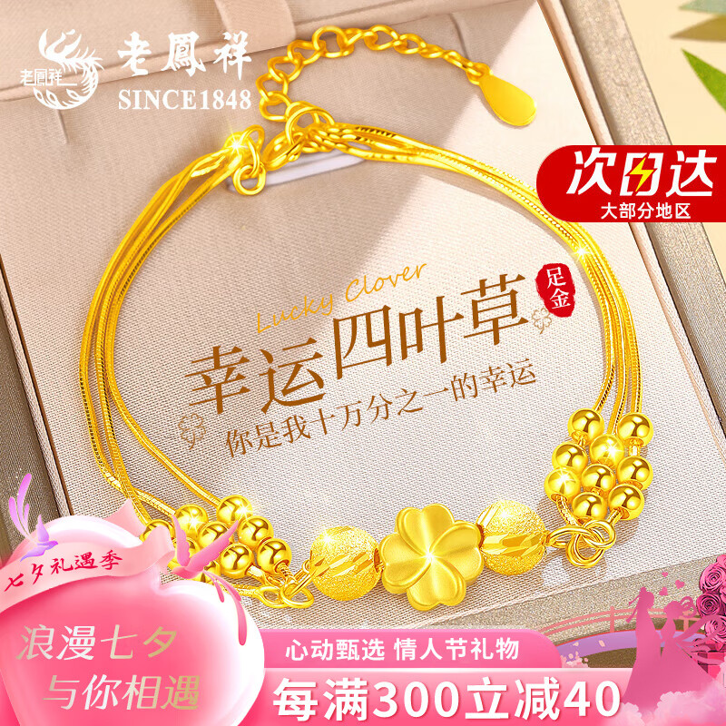 老凤祥四叶草黄金手链女款足金转运珠手串七夕情人节礼物送女友老婆生日 【今/次日达】足金四叶草+赠足银手链