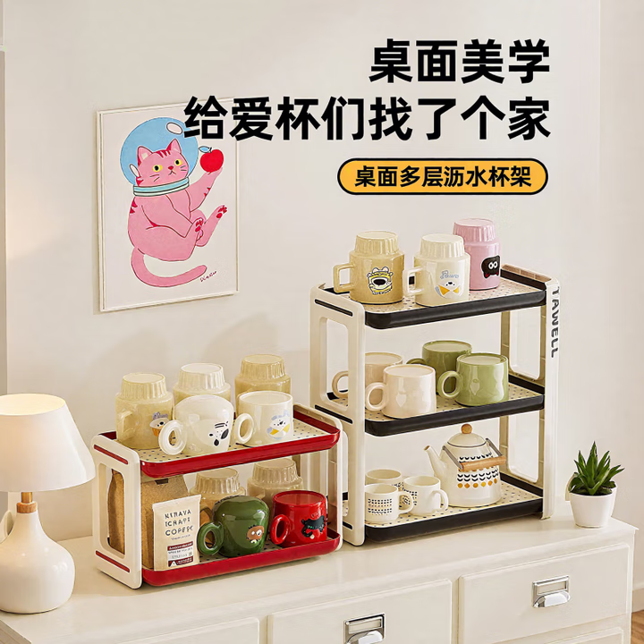 纳份爱杯架桌面水杯茶具置物架双层沥水架餐桌吧台收纳整理架厨房调料架 【奶油红】2 层(自带沥水板) 加宽尺寸任意放.